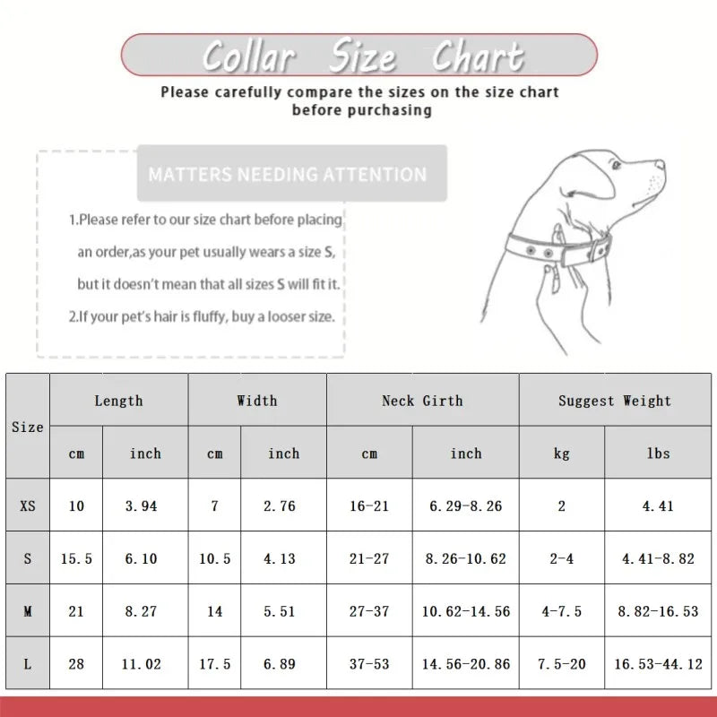 XS: Chest 10cm/3.94'' ; Length 7cm/2..76'' ; Neck 16-21cm/6.29-8.26'' ; Suggest Weight 2 kg/4.41 lbs.