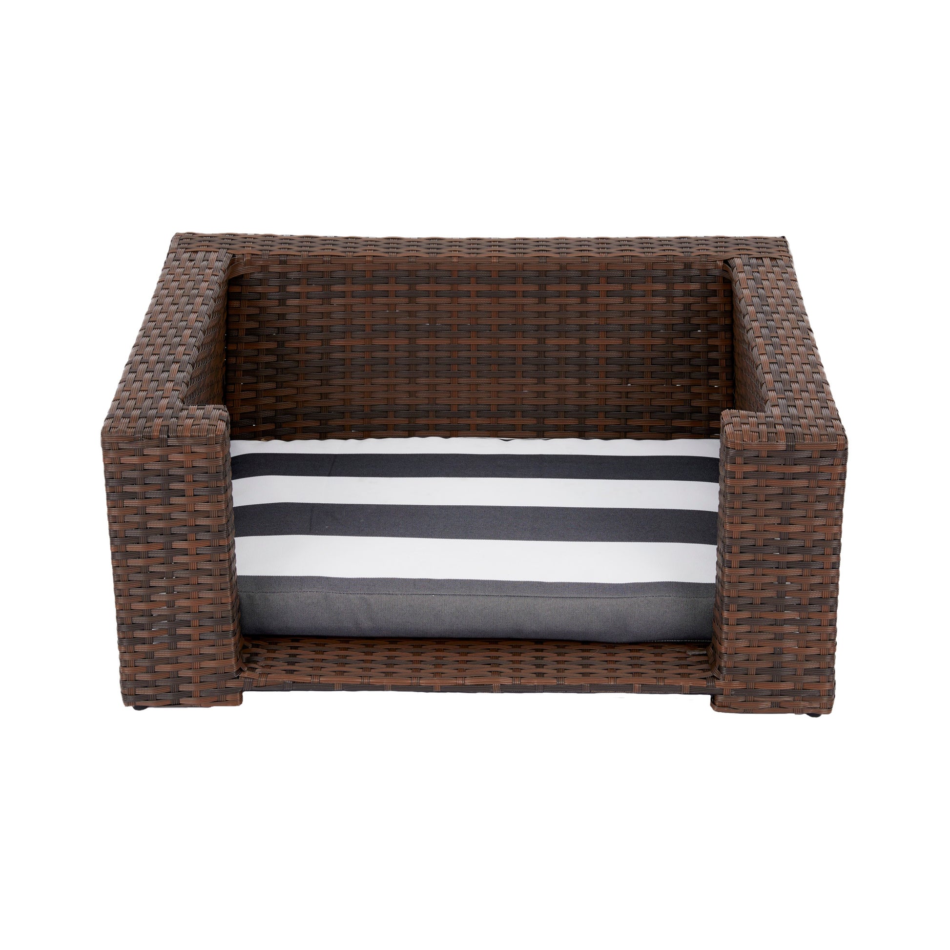 DESIGN: Featuring a lavish brown wicker rattan weaving effect , this rectangular pet bed or sofa lounger can be used indoors or outdoors in the garden, lawn, patio or decking. Suitable for cats and small dogs up to 30kg.